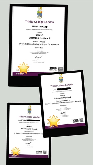 My child has progressed from Beginner to Trinity Level 2 and looks forward to every class. Patient and encouraging teaching, along with clear explanations, has helped build confidence and strong keyboard skills - Parent , India.